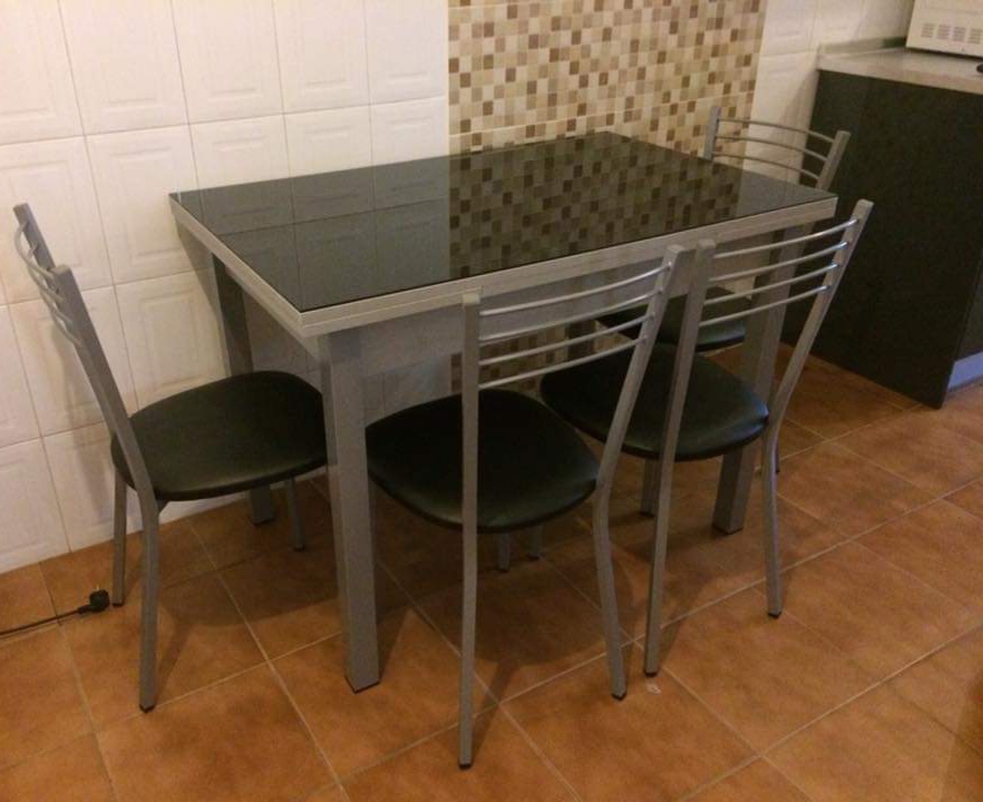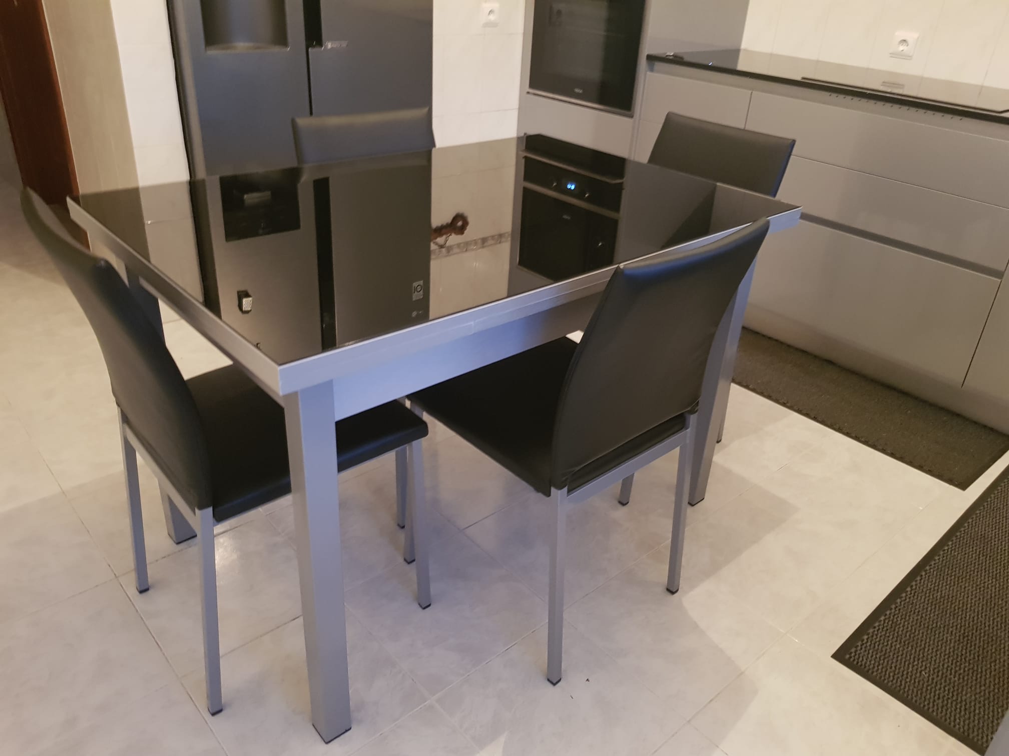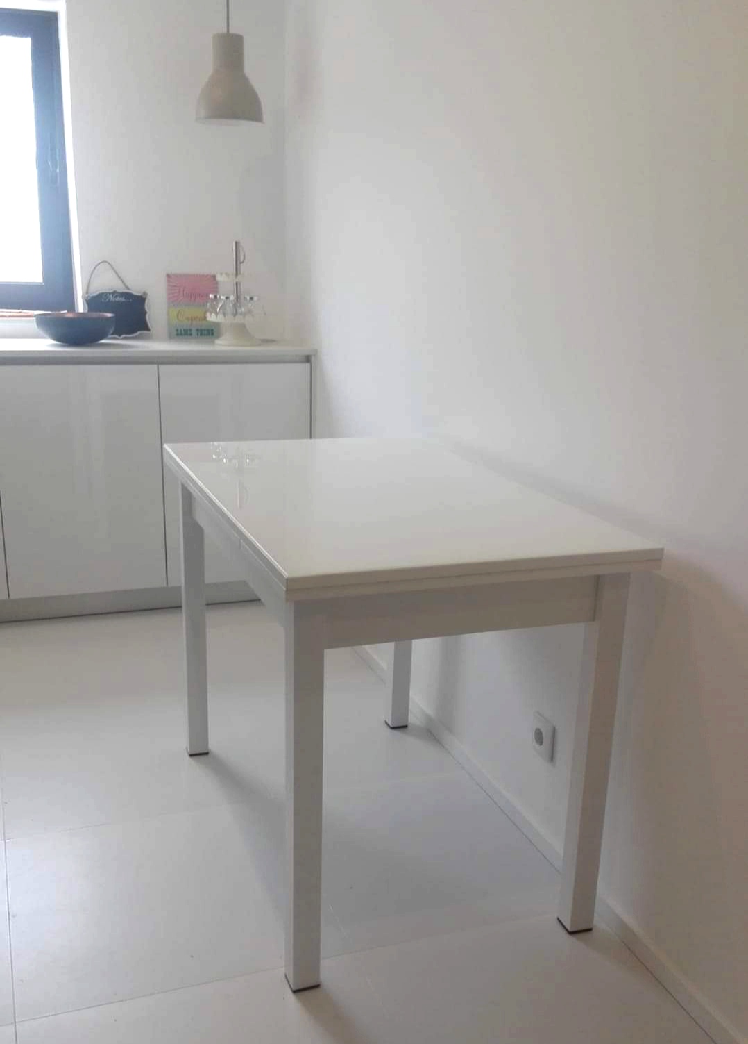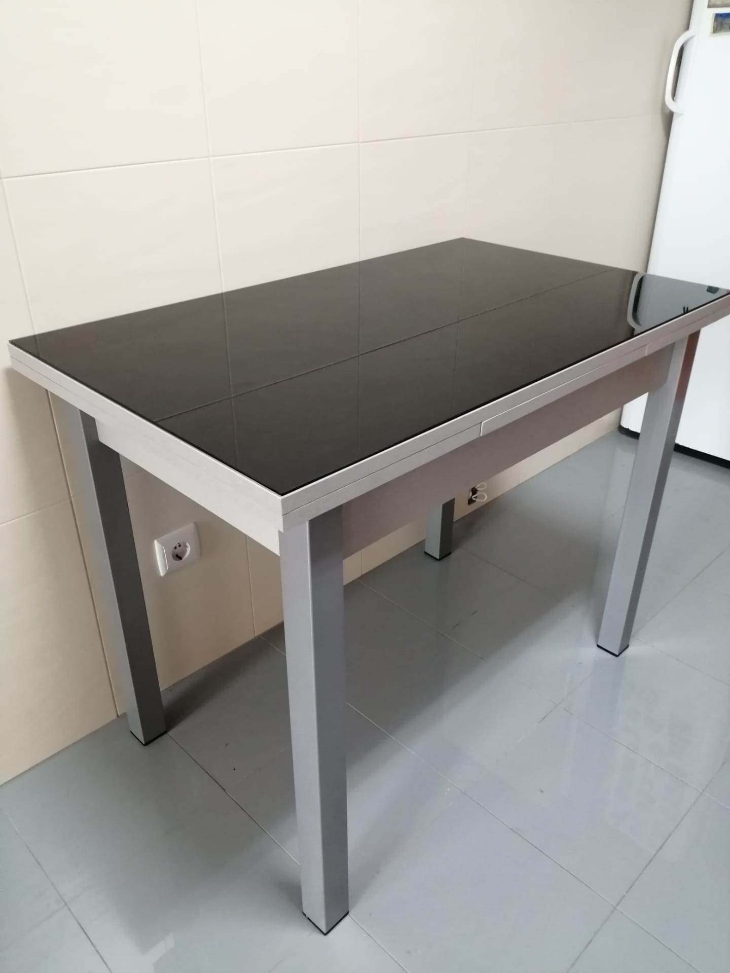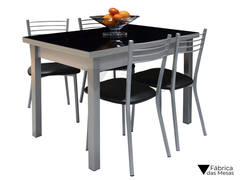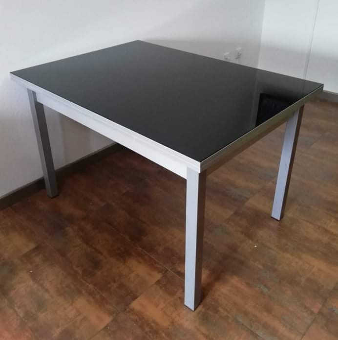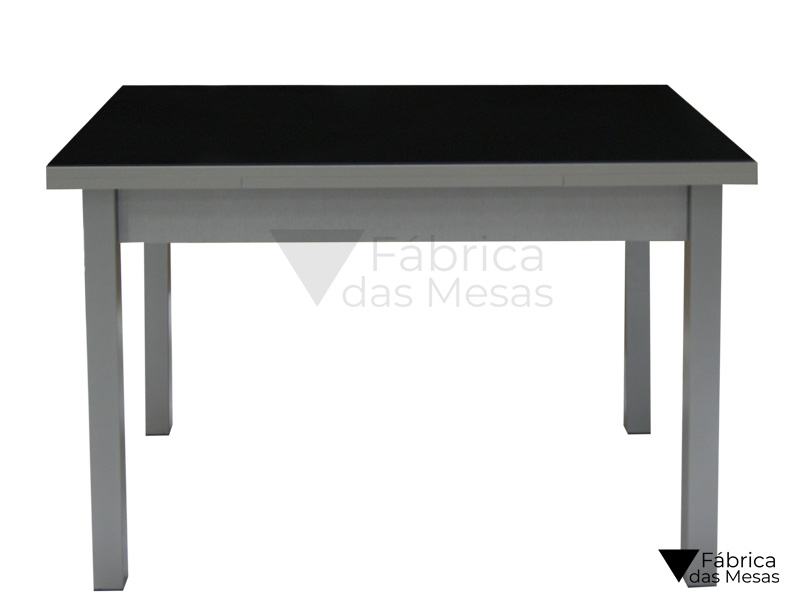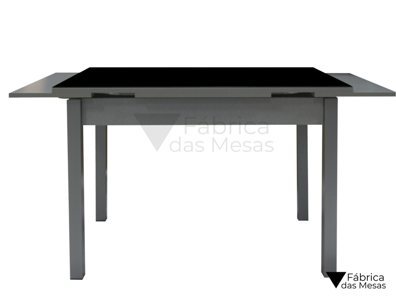 Mesa extensível com tampo, abas e estrutura em laminado SuperPan 19mm, vidro de 4mm no tampo e pés em ferro.